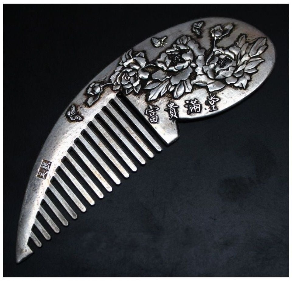 Handwork Collectible Tibetan Silver Carved Flower Wealth Comb Hair Tool Ornament EDC Tools & Brass Collectibles